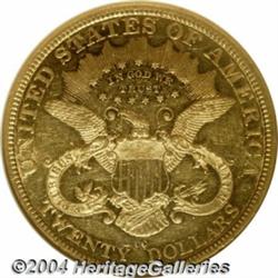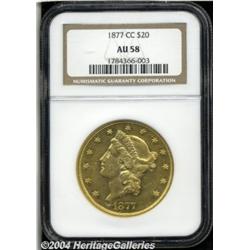 <B>1877-CC<$20> AU58 NGC.</B></I> While not as rare as similarly dated coins of lesser denominations, the '77-CC double eagle is nevertheless a scarce coin. This example is important for its condition with lovely surfaces exhibiting slightly prooflike fields and light abrasions. Population: 33 in 58, 18 finer (3/04). <BR><BR><B>Important notice:</B> Heritage usually auctions material at the rate of 200-250 lots per hour. On some occasions eBay Live bid software or the Internet may not be able to keep up with the pace of the auction. We recommend placing a realistic absentee bid now as insurance to avoid disappointment. Occasionally the auctioneer may eliminate or reject an eBay Live bid, and the auctioneer may also reopen a lot after the close of the eBay live bidding (usually because we missed an audience bid), and may reject your bid even if it shows you as the winning bidder. By bidding via eBay Live, you agree that Heritage may award the lot to another bidder at its sole discretion under the circumstances described above or any other reasonable circumstances. Since eBay bids are not shown to us until we open the lot on the floor, we treat those bids just like floor bids. In most cases the floor responds before the eBay bid is presented to us, due to Internet lag time, so for consistency we have made it a policy that floor bids are always considered first over tie eBay live bids. Also please note that all Heritage lots purchased through eBay Live carry a 20% Buyer's Premium. Please make sure you read the Terms and Conditions before you bid. </span></font></tr></table></td></tr></table>