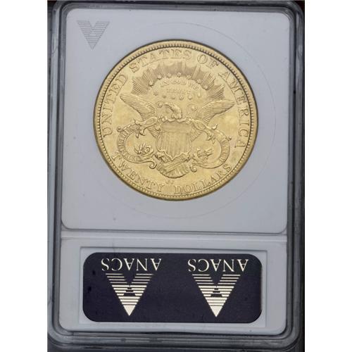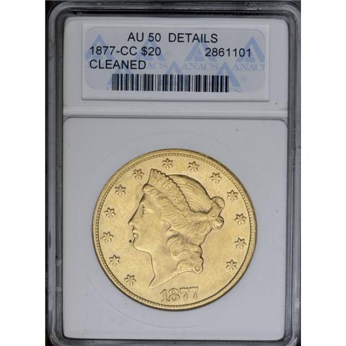 <B>1877-CC<$20>--Cleaned--ANACS. AU50 Details.</B></I> Although the fields are subdued by wispy hairlines, this scarce Carson City twenty has plentiful remaining luster, and oppressive bagmarks are absent.