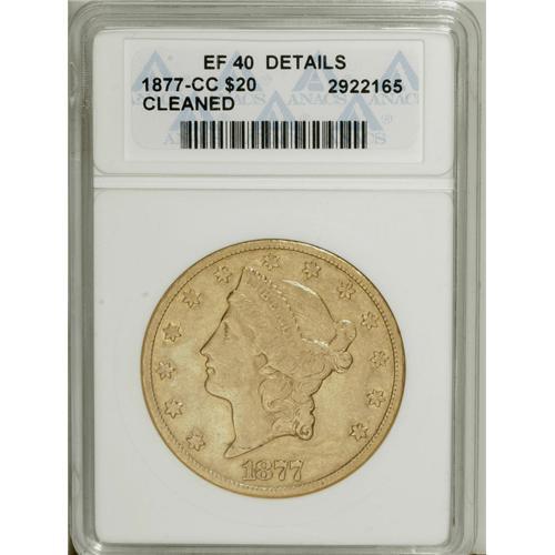 <B>1877-CC $20 --Cleaned--ANACS. XF40 Details.</B></I> This well struck mustard-gold double eagle's surfaces are tinged with orange. Scattered marks and hairlines are present in the fields.<BR><BR><b>Shipping:</b> Coin/Currency (<a target="_blank" href="http://www.heritageauctions.com/common/shipping.php">view shipping information</a>)