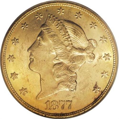 <B>1877-CC $20 MS62 PCGS.</B></I> In recent decades, many 1877-CC double eagles have found their way back into the United States from old, overseas holdings. On the surface, the recovery of long lost specimens of this elusive issue sounds like great news for collectors. In reality, it is bitter-sweet as the vast majority of the repatriated 1877-CC twenties are circulated examples or, at the very least, too heavily abraded to be deemed Mint State. Large gold pieces that are transported in canvas bags over thousands of miles could only be negatively impacted in terms of condition. The NGC <I>Census Report</B></I> and the PCGS <I>Population Report</B></I> paint a clear picture on the absolute rarity of this issue in Mint State grades, as neither service has graded a single example beyond the MS62 level, and the combined number of coins graded as MS62 total only 15 pieces (8/07). One can safely assume that the collective 15 MS62 examples reported by NGC and PCGS is artificially high; the direct result of the same coin being submitted more than once in order to achieve a higher grade opinion. <BR> Doug Winter in his <I>Gold Coins of the Old West, the Carson City Mint 1870-1893</B></I> shares his observations: "This issue is generally found in Very Fine and Extremely Fine grades. About Uncirculated 1877-CC double eagles are somewhat scarce and most survivors in this grade are no better than average quality AU50s. High-end About Uncirculated pieces are quite scarce, while fully Mint State coins are very rare." Breen, Garrett-Guth, and Bowers, in their respective writings on this series, echo Winter's sentiments. The current example is rare, not only as a date, but more importantly as a conditionally challenging issue. This is a remarkably lustrous coin with flashy, semi-prooflike fields. The peripheries have taken on a deeper red patina and there are a couple of grease stains (as struck) close to star 13. Sharply defined throughout, there are a few small abrasions on the obverse but almost none on the reverse. Census: 7 in 62, 0 finer (8/07).<BR><BR><B>Coin Engraver:</B> James B. Longacre<BR><BR><b>Shipping:</b> Coins & Currency (<a target="_blank" href="http://www.heritageauctions.com/common/shipping.php">view shipping information</a>)
