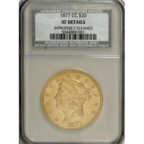 <B>1877-CC $20 --Improperly Cleaned--NCS. XF Details.</B></I> A bit bright from a cleaning, but luster is prominent on the reverse and noticeable on the obverse. Scarcer than the preceding Carson City issues of 1874 to 1876.<BR><BR><B>Coin Engraver:</B> James B. Longacre<BR><BR><b>Shipping:</b> Coins & Currency (<a target="_blank" href="http://www.heritageauctions.com/common/shipping.php">view shipping information</a>\)