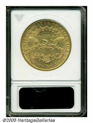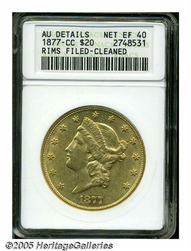 <B>1877-CC<$20>--Rims Filed, Cleaned--ANACS. AU Details, Net XF40.</B></I> A pleasing and well detailed example of this scarcer Carson City Double Eagle. Still mildly lustrous despite a harsh cleaning, with bright orange-gold surfaces and small hairlines scattered over obverse and reverse.