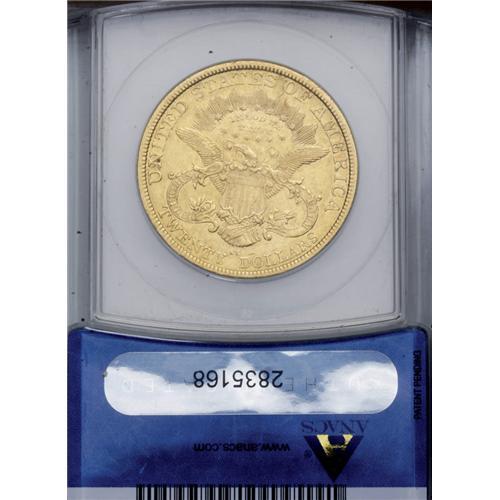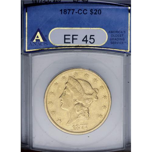 <B>1877-CC<$20> XF45 ANACS.</B></I> This moderately scarce Carson City double eagle displays apricot-gold patination and traces of luster in the protected areas. The design features are generally well brought up, though portions of Liberty's hair are soft. A few light surface and rim marks, especially on the obverse, are typical for the grade.