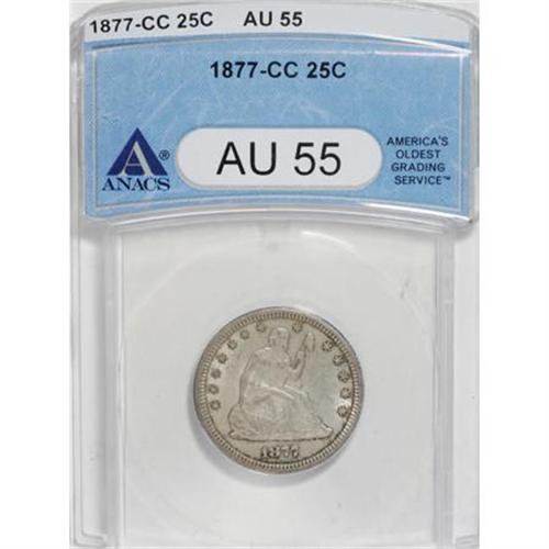 <B>1877-CC 25C AU55 ANACS.</B></I> NGC Census: (13/295). PCGS Population (16/338). Mintage: 4,192,000. Numismedia Wsl. Price for NGC/PCGS coin in AU55: $195. (#5505)<BR><BR><B>Coin Engraver:</B> Christian Gobrecht<BR><BR><b>Shipping:</b> Coins & Currency (<a target="_blank" href="http://www.heritageauctions.com/common/shipping.php">view shipping information</a>\)