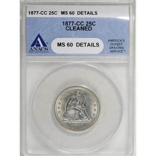 <B>1877-CC 25C --Cleaned--ANACS. MS60 Details.</B></I> NGC Census: (1/264). PCGS Population (3/321). Mintage: 4,192,000. Numismedia Wsl. Price for NGC/PCGS coin in MS60: $300. (#5505)<BR><BR><B>Coin Engraver:</B> Christian Gobrecht<BR><BR><b>Shipping:</b> Coins & Currency (<a target="_blank" href="http://www.heritageauctions.com/common/shipping.php">view shipping information</a>)