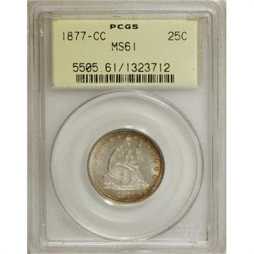 <B>1877-CC 25C MS61 PCGS.</B></I> PCGS Population (18/295). NGC Census: (13/251). Mintage: 4,192,000. Numismedia Wsl. Price for NGC/PCGS coin in MS61: $321. (#5505)<BR><BR><B>Coin Engraver:</B> Christian Gobrecht<BR><BR><b>Shipping:</b> Coins & Currency (<a target="_blank" href="http://www.heritageauctions.com/common/shipping.php">view shipping information</a>)