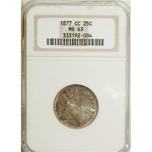 <B>1877-CC 25C MS63 NGC.</B></I> Plum-red toning endows this thoroughly lustrous and precisely struck Carson City quarter. The reverse is well preserved, while the obverse field has only a few faint grazes. Encapsulated in a prior generation holder.<BR><BR><b>Shipping:</b> Coins & Currency (<a target="_blank" href="http://www.heritageauctions.com/common/shipping.php">view shipping information</a>)