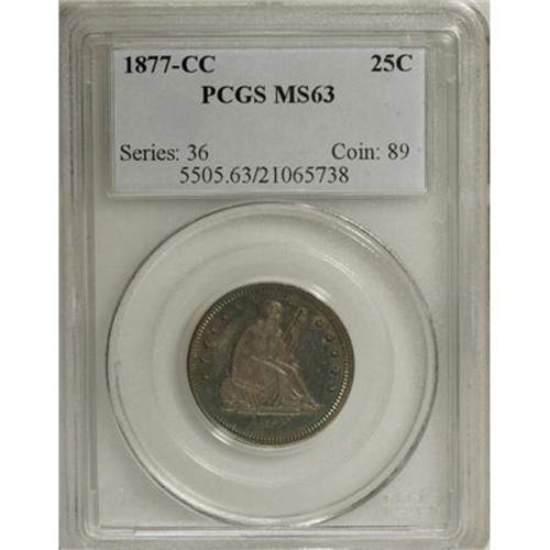 <B>1877-CC 25C MS63 PCGS.</B></I> A pleasing example of this comparatively available Carson City minor silver issue, solidly struck with lovely blue-green and plum toning over each side. Minimally marked overall, though close inspection reveals a handful of wispy abrasions.<BR><BR><B>Coin Engraver:</B> Christian Gobrecht<BR><BR><b>Shipping:</b> Coins & Currency (<a target="_blank" href="http://www.heritageauctions.com/common/shipping.php">view shipping information</a>)