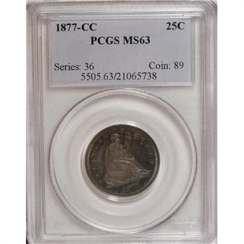 <B>1877-CC 25C MS63 PCGS.</B></I> A pleasing example of this comparatively available Carson City minor silver issue, solidly struck with lovely blue-green and plum toning over each side. Minimally marked overall, though close inspection reveals a handful of wispy abrasions.<BR><BR><B>Coin Engraver:</B> Christian Gobrecht<BR><BR><b>Shipping:</b> Coins & Currency (<a target="_blank" href="http://www.heritageauctions.com/common/shipping.php">view shipping information</a>)