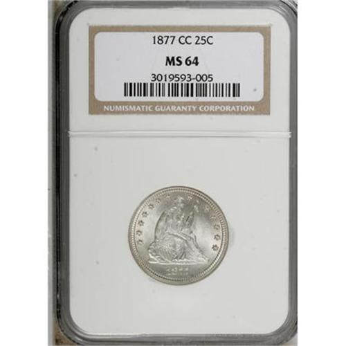<B>1877-CC 25C MS64 NGC.</B></I> Vibrantly lustrous, silver-gray surfaces exhibit sharply struck design elements. Nicely preserved on both sides. Census: 90 in 64, 40 finer (12/07).<BR><BR><B>Coin Engraver:</B> Christian Gobrecht<BR><BR><b>Shipping:</b> Coins & Currency (<a target="_blank" href="http://www.heritageauctions.com/common/shipping.php">view shipping information</a>)