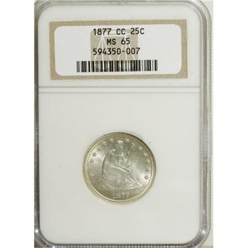 <B>1877-CC 25C MS65 NGC.</B></I> This is the normally seen variety with the mintmark tall and closely spaced. The '77-CC quarter is popular with collectors as its high mintage and relative availability keep it modestly priced. This piece is fully lustrous and sharply struck with bright silver surfaces and a faint trace of gold toning at the borders.<BR><BR><b>Shipping:</b> Coins & Currency (<a target="_blank" href="http://www.heritageauctions.com/common/shipping.php">view shipping information</a>)
