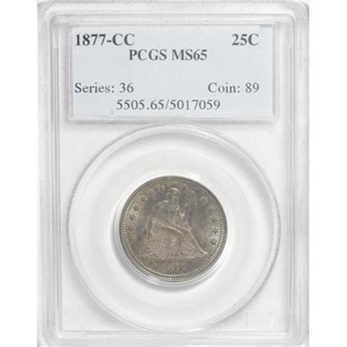 <B>1877-CC 25C MS65 PCGS.</B></I> Rich jade-green and caramel-gold embrace this lustrous Gem. Smooth except for a few small marks on the raised arm. A conditionally rare example of this popular Carson City quarter. Population: 26 in 65, 16 finer (5/07).<BR><BR><b>Shipping:</b> Coins & Currency (<a target="_blank" href="http://www.heritageauctions.com/common/shipping.php">view shipping information</a>)