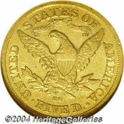 <table><tr><td><table><tr><td>1877-CC $5 AU50 NGC. Variety 1-B. The 1-B variety, one of two die pairings known for the issue, can be easily recognized by the second C in the mintmark being level with the first. The elusive 1877-CC Half Eagle, one of just 8,680 pieces, is curiously overlooked by the strong collector base for Carson City Mint gold coinage. Fewer than 100 pieces are estimated to survive from its limited production and the majority grade no better than VF. The attractive example offered here is reasonably well struck over the central details. Contact marks, although numerous, are well dispersed and do not appreciably detract. <BR><BR><B>Important notice:</B> Heritage usually auctions material at the rate of 200-250 lots per hour. On some occasions eBay Live bid software or the Internet may not be able to keep up with the pace of the auction. We recommend placing a realistic absentee bid now as insurance to avoid disappointment. Occasionally the auctioneer may eliminate or reject an eBay Live bid, and the auctioneer may also reopen a lot after the close of the eBay live bidding (usually because we missed an audience bid), and may reject your bid even if it shows you as the winning bidder. By bidding via eBay Live, you agree that Heritage may award the lot to another bidder at its sole discretion under the circumstances described above or any other reasonable circumstances. Since eBay bids are not shown to us until we open the lot on the floor, we treat those bids just like floor bids. In most cases the floor responds before the eBay bid is presented to us, due to Internet lag time, so for consistency we have made it a policy that floor bids are always considered first over tie eBay live bids. Also please note that all Heritage lots purchased through eBay Live carry a 20% Buyer's Premium. Please make sure you read the Terms and Conditions before you bid. <BR><BR><B>IMPORTANT ANNOUNCEMENT ABOUT RESERVES:</B> Heritage now divulges all reserves on its web site 7 days before every auction. If you want to know whether the reserve on this lot has been met, and if not, what the reserve amount is, please visit this lot page on the HeritageCoin.com web site, or email: bid@HeritageGalleries.com </span></font></td></tr></table></td></tr></table>