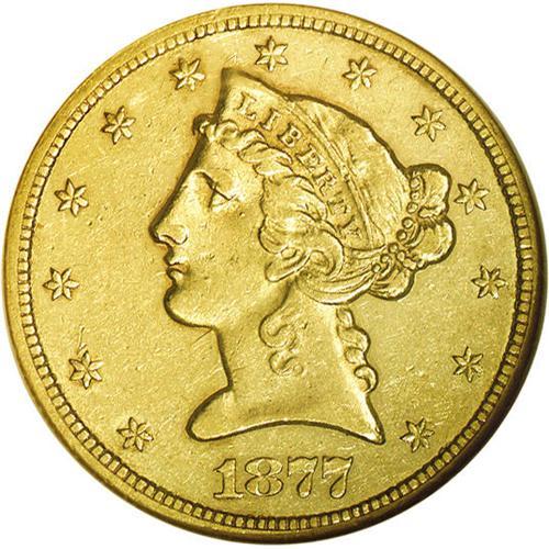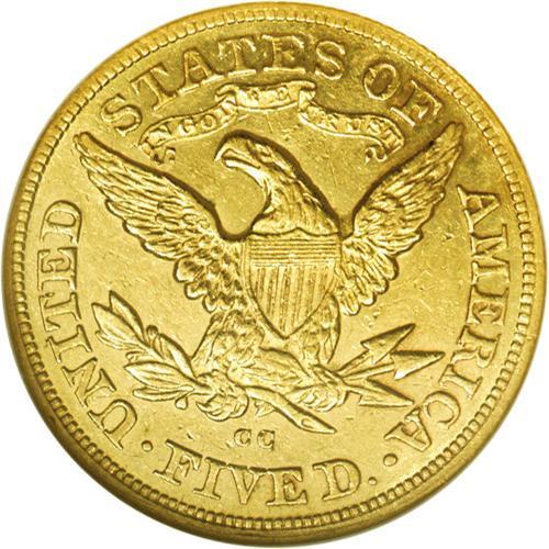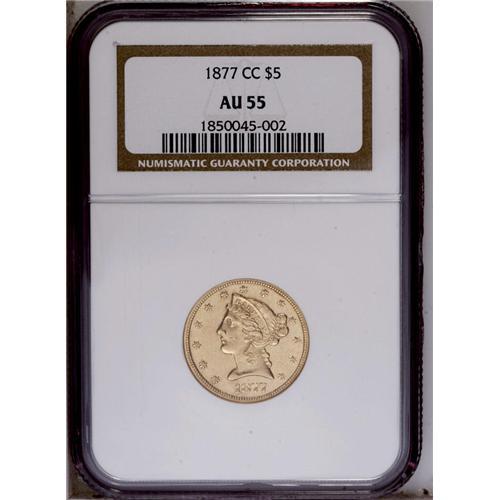 <B>1877-CC<$5> AU55 NGC.</B></I> Variety 1-B. The 1-B pairing is most easily distinguished by the second C in the mintmark being level with the first. Sharply defined on the obverse with the usually seen weakness on the eagle's neck feathers, the surfaces are bright yellow-gold with significant portions of mint luster still surrounding the devices. This is one of the finer pieces known with several other AU examples and only two pieces thus far certified in Mint State by either service. Census: 13 in 55, 4 finer (3/06). <BR><BR><B>Important notice:</B> Heritage usually auctions material at the rate of 200-250 lots per hour. On some occasions eBay Live bid software or the Internet may not be able to keep up with the pace of the auction. We recommend placing a realistic absentee bid now as insurance to avoid disappointment. Occasionally the auctioneer may eliminate or reject an eBay Live bid, and the auctioneer may also reopen a lot after the close of the eBay live bidding (usually because we missed an audience bid), and may reject your bid even if it shows you as the winning bidder. By bidding via eBay Live, you agree that Heritage may award the lot to another bidder at its sole discretion under the circumstances described above or any other reasonable circumstances. Since eBay bids are not shown to us until we open the lot on the floor, we treat those bids just like floor bids. In most cases the floor responds before the eBay bid is presented to us, due to Internet lag time, so for consistency we have made it a policy that floor bids are always considered first over tie eBay live bids. Also please note that all Heritage lots purchased through eBay Live carry a 20% Buyer's Premium. Please make sure you read the Terms and Conditions before you bid. This lot is being auctioned in conjunction with a live floor auction by Heritage Galleries & Auctioneers. All final auction and invoice information will be supplied by Heritage Galleries & Auctioneers, and all other information should be considered preliminary. Lot:2796 <BR><BR><B>Winning Notification and Billing:</B> After the FINAL session in this auction is complete, Heritage will send e-mail and snail mail invoices. This process normally takes several days. All final auction and invoice information will be supplied by Heritage Galleries & Auctioneers, and all other information should be considered preliminary. <BR><BR>This auction will be conducted on a live auction floor and over the Internet through eBay Live. If you choose to place an absentee bid, please take a moment to <font color='#0000ff'><u><a href='http://pages.ebay.com/liveauctions/help/before/laabsentee.html'>learn how eBay Live absentee bidding works</a></u></font><font color='#000000'>