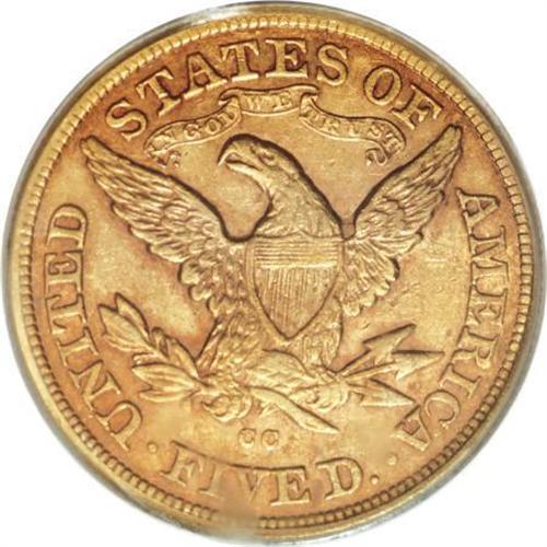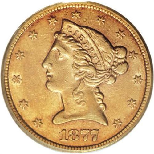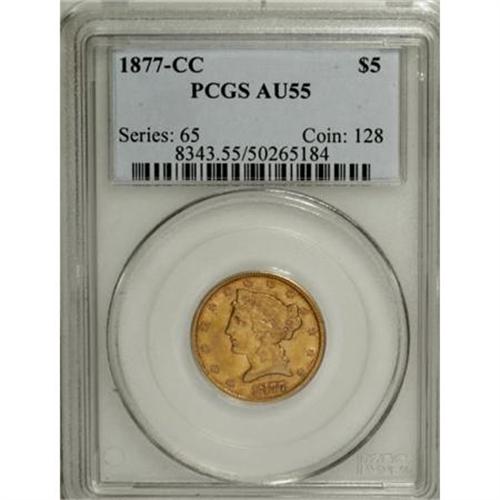 <B>1877-CC $5 AU55 PCGS.</B></I> The low-mintage 1877-CC (8,680 pieces), is scarce in all grades. When available, it usually grades Very Fine to Extremely Fine. About Uncirculated examples are rare, and just a couple of Mint State pieces are known.<BR> Rich reddish-gold patination, imbued with wisps of lilac and sky-blue, adorns both sides of the Choice AU coin in this lot. The design features are nicely defined, better so that often seen on this issue, save for minor softness in the hair bun and eagle's neck feathers. A good amount of luster resides in the areas around, and in the recesses of, the motifs. This coin possesses attractive surfaces, unlike typically seen examples alluded to by Douglas Winter (2001) that are" very heavily abraded" or "... hairlined or unnaturally bright from numismatic abuse."<BR><BR><B>Coin Engraver:</B> Christian Gobrecht<BR><BR><b>Shipping:</b> Coins & Currency (<a target="_blank" href="http://www.heritageauctions.com/common/shipping.php">view shipping information</a>\)