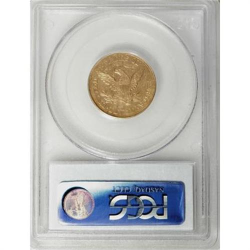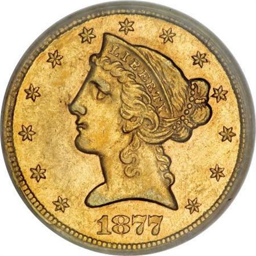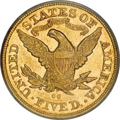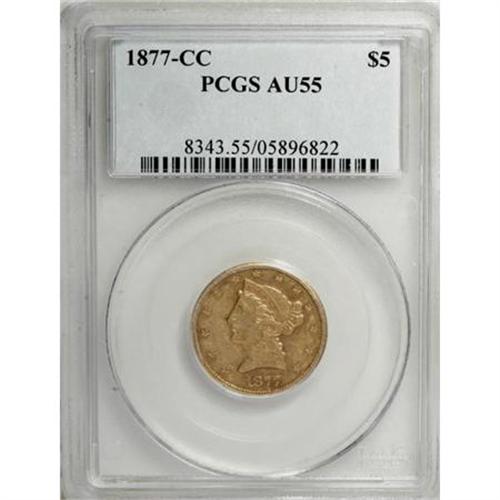 <B>1877-CC $5 AU55 PCGS.</B></I> The 1877-CC half eagle is scarce in all grades. When available, the typical coin grades Very Fine to low-end Extremely Fine. Choice XF pieces are very scarce, and low-end About Uncirculated pieces are rare. Choice AU coins are very rare, and Mint State examples are virtually unknown (Douglas Winter, <I>Gold Coins of the Carson City Mint</B></I>).<BR> This AU55 coin displays honey-gold colored surfaces whose fields are partially prooflike. The design elements are quite well delineated, much better so than often found. There are a few minuscule marks scattered about, but not of the frequency or severity normally occurring on representatives of this date.<BR><BR><B>Coin Engraver:</B> Christian Gobrecht<BR><BR><b>Shipping:</b> Coins & Currency (<a target="_blank" href="http://www.heritageauctions.com/common/shipping.php">view shipping information</a>)