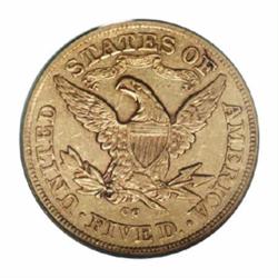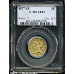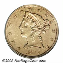 <TABLE cellSpacing=0 cellPadding=0 width="100%" bgColor=#000000 border=0><TBODY><TR><TD width="100%"><TABLE cellSpacing=1 cellPadding=3 width="100%" border=0><TBODY><TR><TD width="100%" bgColor=#79735c><FONT face=arial color=#ffffff size=3><B>Description</B> </FONT></TD></TR><TR><TD width="100%" bgColor=#ffffff><FONT face=arial size=2><B>1877-CC $5 XF45 PCGS.</B></I> Winter 1-B. The 1-B variety, one of two die pairings known for the issue, can be easily recognized by the second C in the mintmark being level with the first. The elusive 1877-CC Half Eagle, one of just 8,680 pieces, is curiously overlooked by the strong collector base for Carson City Mint gold coinage. Fewer than 100 pieces are estimated to survive from its limited production and the majority grade no better than VF. The attractive example offered here displays remnants of semi-reflective luster in the fields and is reasonably well struck over the central details. Contact marks are well dispersed and do not appreciably detract. The Ashland City specimen (an NGC AU53), which did not surpass this piece in eye appeal, fetched over $7,700 in our January FUN Sale. Population: 15 in 45, 16 finer (8/03). </FONT></TD></TR></TBODY></TABLE></TD></TR></TBODY></TABLE><BR><A name=PricesRealized></A><TABLE cellSpacing=0 cellPadding=0 width="100%" bgColor=#000000 border=0><TBODY><TR><TD width="100%"><TABLE cellSpacing=1 cellPadding=3 width="100%" border=0><TBODY><TR><TD width="100%" bgColor=#79735c><A name=PR><FONT face=arial color=#ffffff size=3><B>Previous Prices from Heritage Auctions</B> </FONT></A></TD></TR><TR><TD bgColor=#f6f6ed><TABLE cellSpacing=0 cellPadding=0 width="100%" border=1><TBODY><TR><TD align=middle width="33%"><B>Date</B></TD><TD align=middle width="33%"><B>Service</B></TD><TD align=middle width="33%"><B>Price</B></TD></TR><TR bgColor=whitesmoke><TD width="33%"><B>10/01/1993</B></TD><TD width="33%">PCGS</TD><TD width="33%">$5,720.00</TD></TR><TR bgColor=whitesmoke><TD width="33%"><B>01/10/1998</B></TD><TD width="33%">NGC</TD><TD width="33%">$3,220.00</TD></TR><TR bgColor=whitesmoke><TD width="33%"><B>05/01/1999</B></TD><TD width="33%">ANACS</TD><TD width="33%">$2,585.00</TD></TR></TBODY></TABLE></TD></TR><TR><TD bgColor=#ffffff><FONT face=arial size=1 ?>PLEASE NOTE: All prices realized reflect the final hammer price PLUS the buyer's premium in auctions that charge a buyer's premium. Each item has a notation at the top of the listing indicating whether that lot included a buyer's premium. Example: A item that sells with a final hammer price of $100 and a 20% buyer's premium will display with a price realized of $120. All information listed is intended to be as accurate as possible, but errors are possible. Please use this guide carefully and inform us of any inaccuracies. </FONT></TD></TR></TBODY></TABLE></TD></TR></TBODY></TABLE><BR><TABLE cellSpacing=0 cellPadding=0 width="100%" bgColor=#000000 border=0><TBODY><TR><TD width="100%"><TABLE cellSpacing=1 cellPadding=3 width="100%" border=0><TBODY><TR><TD width="100%" bgColor=#79735c colSpan=6><FONT face=arial color=#ffffff size=3><B>Price Guide*</B> </FONT></TD></TR><TR bgColor=#f6f6ed><TD align=middle><B>Grade</B> </TD><TD align=middle><B>Coin World<BR>(Trends)</B> </TD><TD align=middle><B>Numismedia<BR>Retail</B> </TD><TD align=middle><B>Numismedia<BR>Wholesale</B> </TD><TD align=middle><B>Coin<BR>Universe</B> </TD><TD align=middle><B>Heritage<BR>Value Index</B> </TD></TR><TR bgColor=#ffffff><TD align=middle>40</TD><TD align=right>$3,600.00</TD><TD align=right>---</TD><TD align=right>$3,625.00</TD><TD align=right>$3,125.00</TD><TD align=right>$2,199.17</TD></TR><TR style="FONT-WEIGHT: bold" bgColor=#cccfdd><TD align=middle>45</TD><TD align=right>$4,250.00</TD><TD align=right>---</TD><TD align=right>---</TD><TD align=right>---</TD><TD align=right>$4,042.78</TD></TR><TR bgColor=#ffffff><TD align=middle>50</TD><TD align=right>$8,250.00</TD><TD align=right>---</TD><TD align=right>$6,425.00</TD><TD align=right>---</TD><TD align=right>$6,668.06</TD></TR><TR bgColor=#ffffff><TD colSpan=6><FONT size=1>*All information listed is intended to be as accurate as possible, but errors are possible. No item may be returned or refused based on this information which is provided as a service to our customers. You should contact each pricing source directly to determine the accuracy of this information. </FONT></TD></TR></TBODY></TABLE></TD></TR></TBODY></TABLE><BR><TABLE cellSpacing=0 cellPadding=0 width="100%" bgColor=#000000 border=0><TBODY><TR><TD width="100%"><TABLE cellSpacing=1 cellPadding=3 width="100%" border=0><TBODY><TR><TD width="100%" bgColor=#79735c><FONT face=arial color=#ffffff size=3><B>Population Guide</B> </FONT></TD></TR><TR bgColor=#ffffff><TD align=middle><!-- Begin Output of Population Grid--><TABLE cellSpacing=0 cellPadding=0 width="100%" border=0><TBODY><TR><TD vAlign=center><TABLE cellSpacing=0 width="100%" border=1 cellsadding="3"><TBODY><TR><TD vAlign=center><TABLE cellSpacing=0 cellPadding=3 width="100%" border=1><TBODY><TR><TD vAlign=center align=middle bgColor=#f0f1e8 colSpan=2 <CENTER><FONT face=Arial size=2><B>PCGS Pop </B></FONT><CENTER></CENTER></TD><TD vAlign=center align=middle bgColor=#f0f1e8 colSpan=2><CENTER><FONT face=Arial size=2><B>NGC Pop</B></CENTER></FONT></TD></TR><TR><TD vAlign=center><FONT face=Arial size=2>(45)</FONT> </TD><TD vAlign=center align=right><FONT face=Arial size=2>15</FONT> </TD><TD vAlign=center><FONT face=Arial size=2>(45)</FONT> </TD><TD vAlign=center align=right><FONT face=Arial size=2>15</FONT> </TD></TR><TR><TD vAlign=center><FONT face=Arial size=2>(>45)</FONT> </TD><TD vAlign=center align=right><FONT face=Arial size=2>16</FONT> </TD><TD vAlign=center><FONT face=Arial size=2>(>45)</FONT> </TD><TD vAlign=center align=right><FONT face=Arial size=2>17</FONT> </TD></TR></TBODY></TABLE></TD></TR></TBODY></TABLE></TD></TR></TBODY></TABLE><!-- End Output of Population Grid--> Important notice: Heritage usually auctions materia