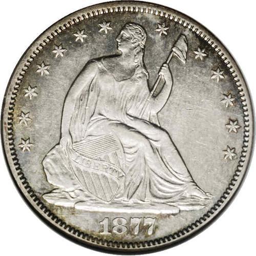 1877-CC 50C AU55 NGC. Peripheral aquamarine and olive- 1877-CC[50C] AU55 NGC.