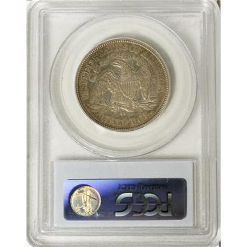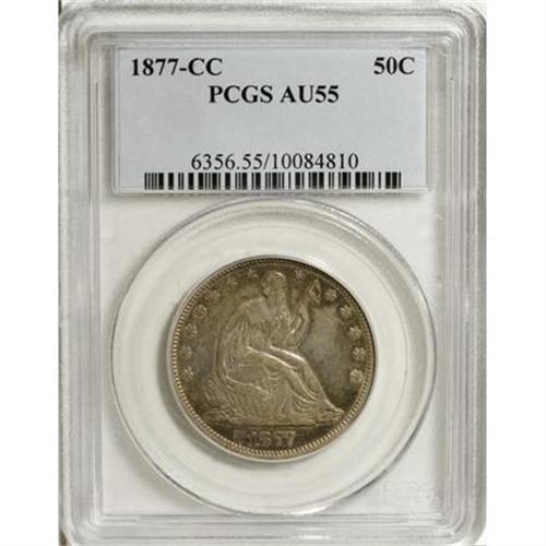 <B>1877-CC 50C AU55 PCGS.</B></I> This Choice AU Carson City Mint specimen displays bright golden-tan centers framed by cobalt-blue and gold-orange on the obverse margins, and deep olive-green, blue, and golden-brown on the reverse peripheries. Sharply struck, and devoid serious contact marks.<B><BR></B></I><I>From The Beau Clerc Collection.</B></I><BR><BR><B>Coin Engraver:</B> Christian Gobrecht<BR><BR><b>Shipping:</b> Coins & Currency (<a target="_blank" href="http://www.heritageauctions.com/common/shipping.php">view shipping information</a>)