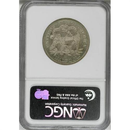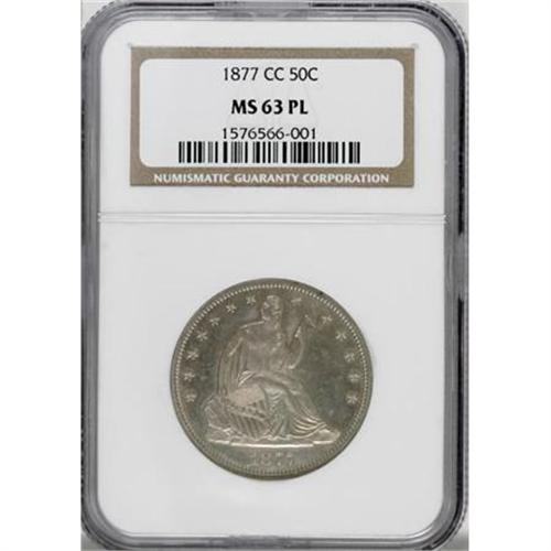 <B>1877-CC 50C MS63 Prooflike NGC.</B></I> Type One Reverse. One of just two Prooflike examples graded by NGC, each certified as MS63 (3/08). This slightly hazy gold-toned example has bold detail and distinctly reflective surfaces. A surprising treasure from this popular Carson City issue.<BR><BR><B>Coin Engraver:</B> Christian Gobrecht<BR><BR><b>Shipping:</b> Coins & Currency (<a target="_blank" href="http://www.heritageauctions.com/common/shipping.php">view shipping information</a>)