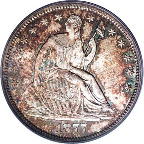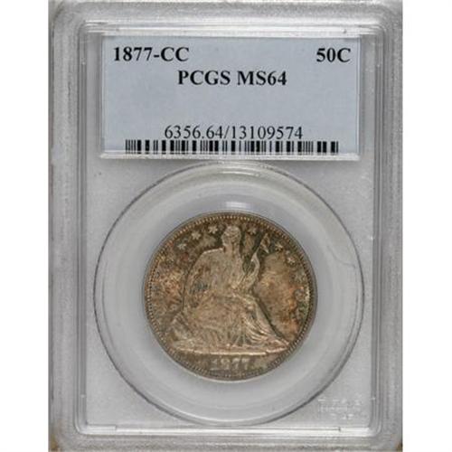 <B>1877-CC 50C MS64 PCGS.</B></I> Type Two Reverse. Though the minor coins of Carson City are not so well known as its silver dollars or its gold pieces, examples such as the present piece have their own allure. Modestly reflective, strongly lustrous surfaces shine beneath rich, dappled tan, gray, and gold-orange color. The strike is sharp, and the overall eye appeal is undeniable. Population: 41 in 64, 21 finer (4/07).<BR><BR><b>Shipping:</b> Coins & Currency (<a target="_blank" href="http://www.heritageauctions.com/common/shipping.php">view shipping information</a>)