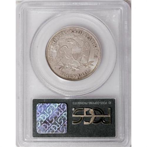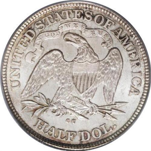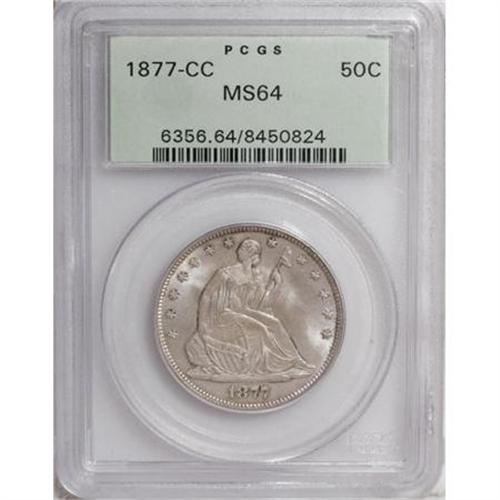 <B>1877-CC 50C MS64 PCGS.</B></I> Type Two Reverse. A lovely near-Gem, the lustrous surfaces are lightly toned on the obverse and more richly colored on the reverse. Both sides show varying shades of rose, violet, and pastel blue patina over each side. Nicely struck with intermittent dark spots and minimal marks. <BR><BR><b>Shipping:</b> Coins & Currency (<a target="_blank" href="http://www.heritageauctions.com/common/shipping.php">view shipping information</a>)