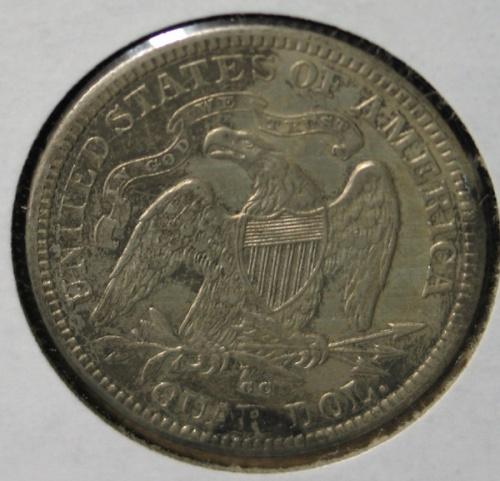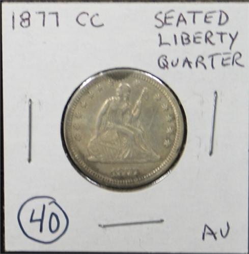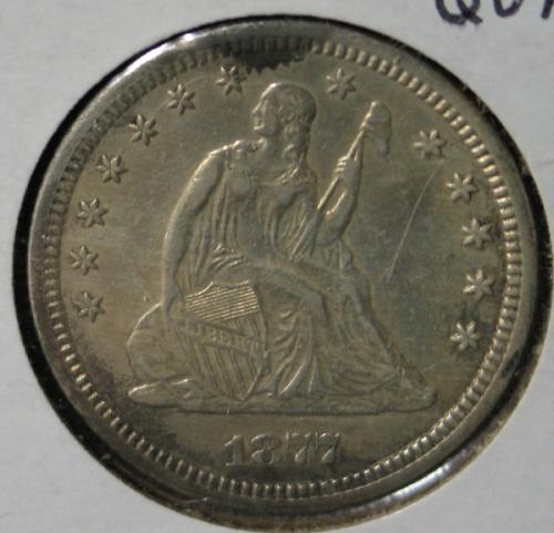 1877 CC SEATED LIBERTY QUARTER. AU.
