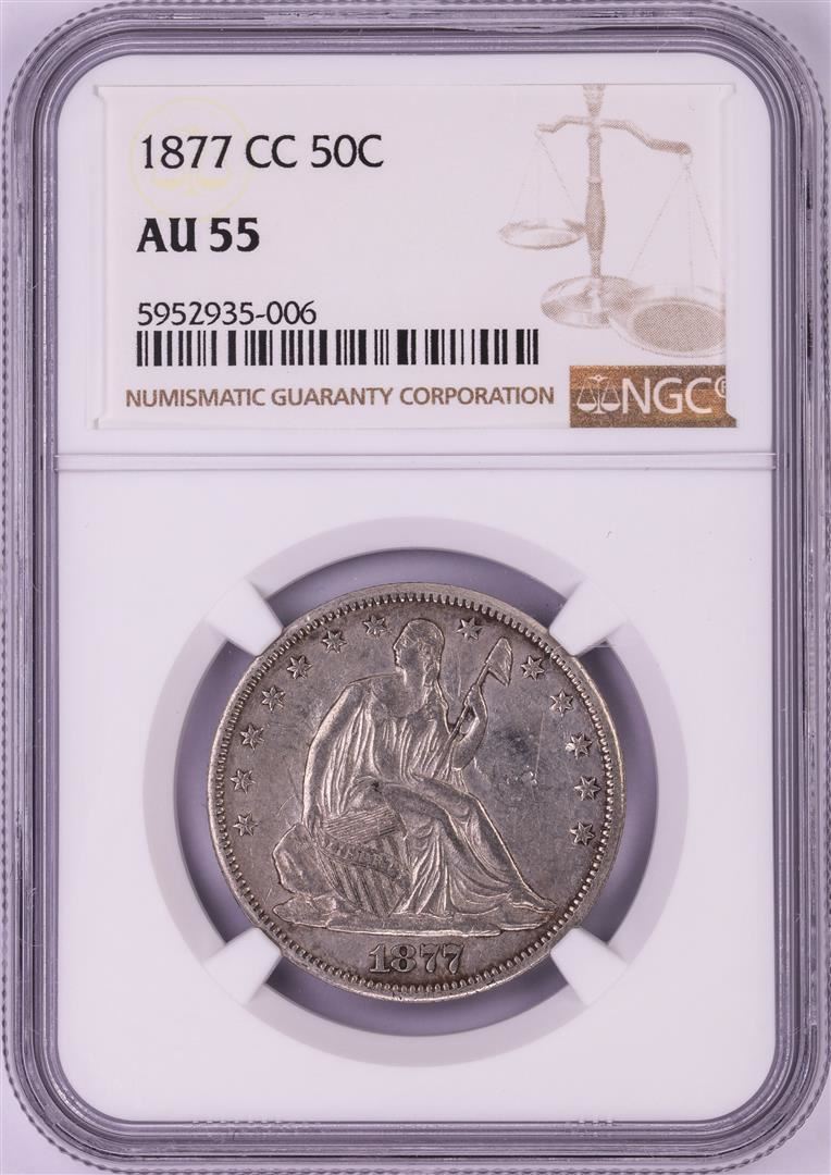 One 1877-CC Seated Liberty Half Dollar Coin NGC AU55. NGC Certified.
