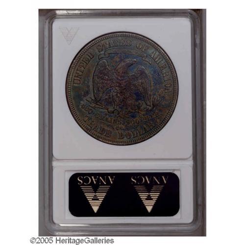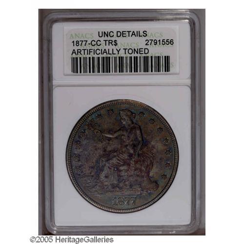<B>1877-CC<T$1>--Artificially Toned--ANACS. Unc Details.</B></I> This better date but lackluster CC-mint Trade Dollar is deeply toned in blue-green and mauve colors. A few minor obverse marks are distributed. The base of the 1 in the date is lightly repunched.