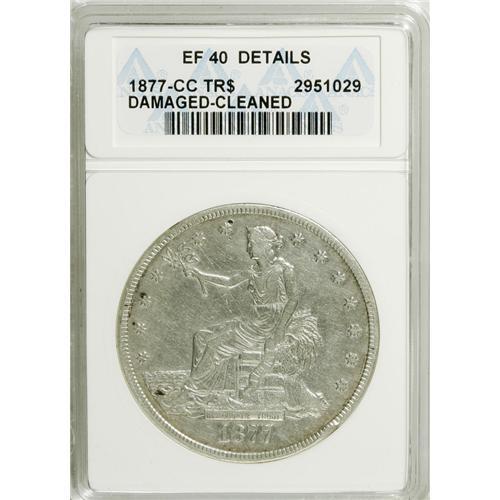 <B>1877-CC T$1 --Cleaned, Damaged--ANACS. XF40 Details.</B></I> NGC Census: (3/91). PCGS Population (9/92). Mintage: 534,000. Numismedia Wsl. Price: $325. (#7045)<BR><BR><b>Shipping:</b> Coins & Currency (<a target="_blank" href="http://www.heritageauctions.com/common/shipping.php">view shipping information</a>)