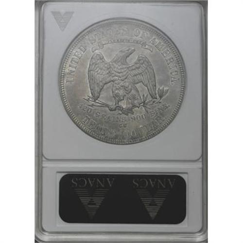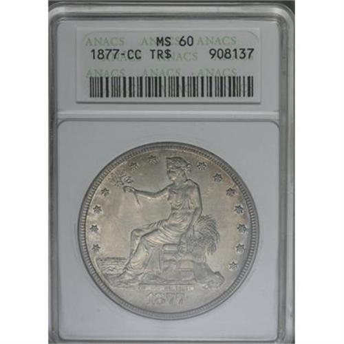 <B>1877-CC T$1 MS60 ANACS.</B></I> Crisply struck on all of the design elements, including Liberty's head and the eagle's talons. The fields are semi-reflective and flashy, with lovely, natural champagne-gold and sunset-orange toning. A few small abrasions limit the grade. A scarce Carson City issue in Mint State. <BR><BR><B>Coin Engraver:</B> William Barber<BR><BR><b>Shipping:</b> Coins & Currency (<a target="_blank" href="http://www.heritageauctions.com/common/shipping.php">view shipping information</a>)