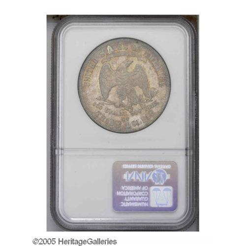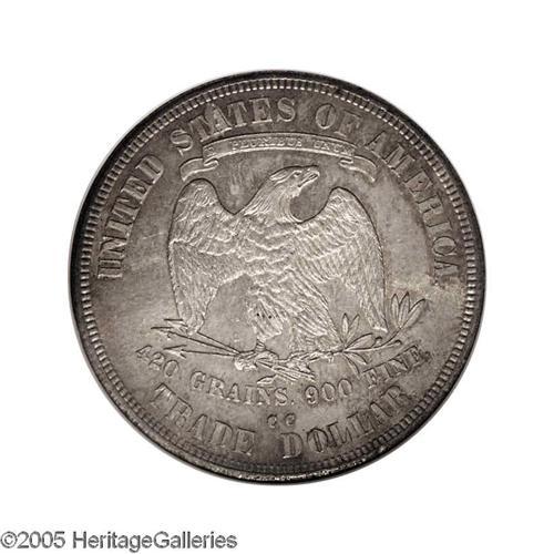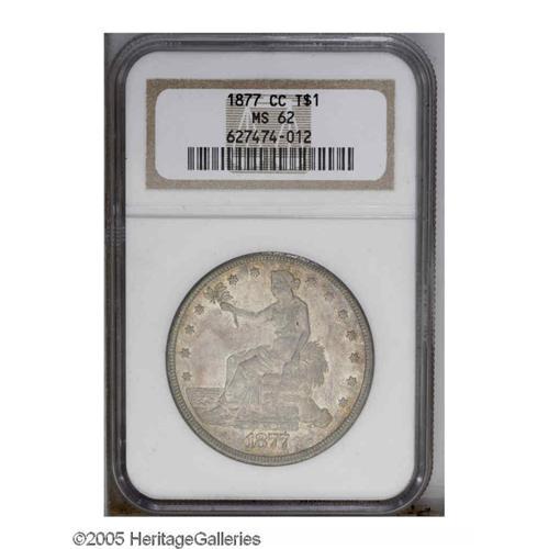 <B>1877-CC<T$1> MS62 NGC.</B></I> Breen-5817. In its appearance in a 1986 Stack's auction, the present piece was described as "A beauty with russet, orange and light iridescent toning. Certainly one of the finest offered in recent years." The mildly prooflike fields are only lightly marked for the grade. The two 7s in the date are repunched at their bases, and 420 GRAINS 900 FINE exhibits minor die doubling. Population: 11 in 62, 23 finer (10/05).<BR><I>Ex: Fairfield County Cooperative Foundation, Stack's, 9/86, lot 795, which realized $1,760.</B></I><BR><I>From The Albert E. Willis Collection.</B></I>