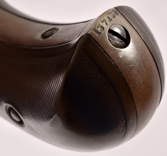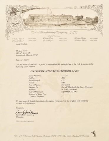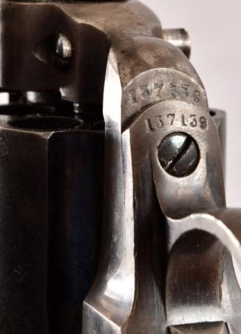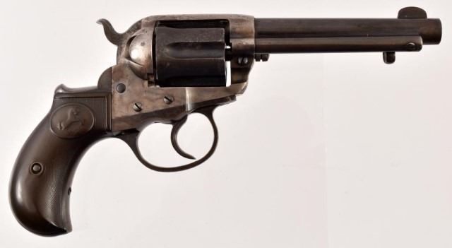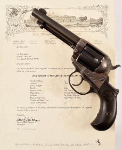 90% condition, with factory letter. 4.5" barrel, rampant colt checkered grips. SN 137139 (1902)
