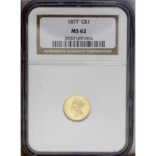 1877 G$1 MS62 NGC. A nice example of this scarce, low 1877[G$1] MS62 NGC.