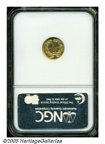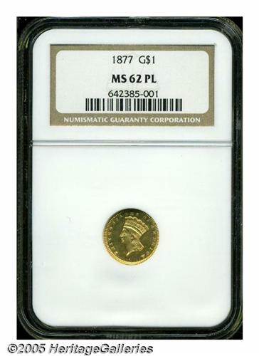 <B>1877<G$1> MS62 Prooflike NGC.</B></I> The deeply reflective, prooflike fields provide substantial contrast with mildly frosted devices. Sharply struck with a few wispy marks and luster grazes that restrict the grade. Population: 8 in 62 Prooflike, 0 finer in Prooflike condition (4/05).
