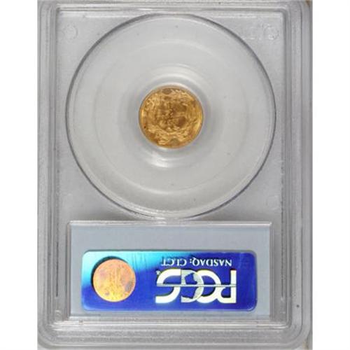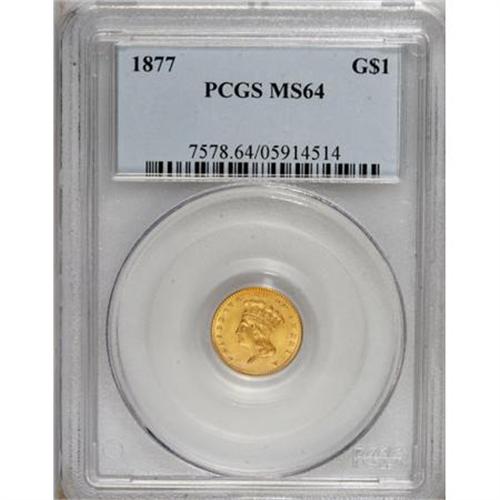 <B>1877 G$1 MS64 PCGS.</B></I> Lustrous and boldly struck, with just a trace of die rust noted on each side. This is an attractive orange-gold example that shows a superficial mark to the left of Liberty's mouth, and a faint grease streak (as made) on the left side of the reverse, near the rim at 9 o'clock. Population: 25 in 64, 32 finer (8/07). <BR><BR><B>Coin Engraver:</B> James B. Longacre<BR><BR><b>Shipping:</b> Coins & Currency (<a target="_blank" href="http://www.heritageauctions.com/common/shipping.php">view shipping information</a>)
