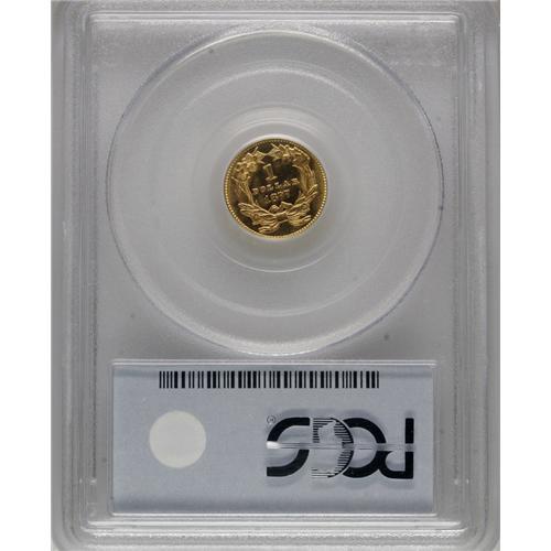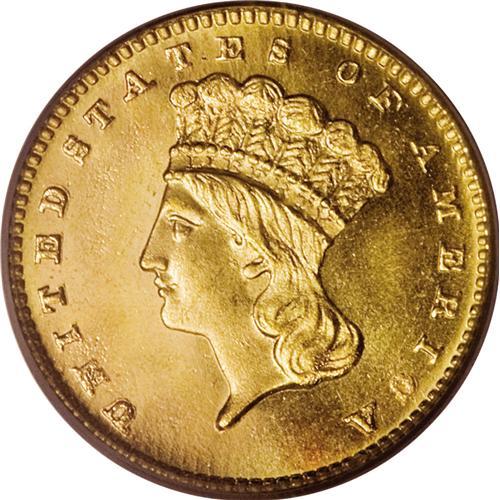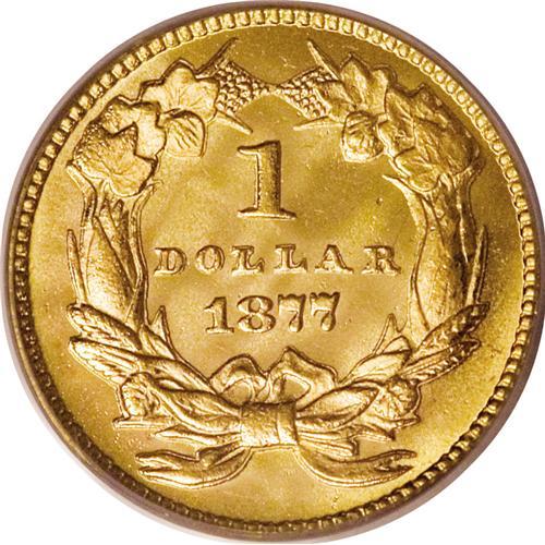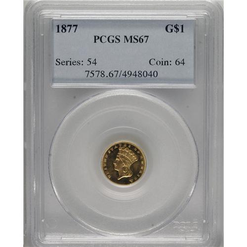 <B>1877 G$1 MS67 PCGS.</B></I> The year 1877 is a special one in the annals of U.S. numismatics, because so many issues in various series bearing this date are key coins: the Indian cent, three cent nickel, Shield five cent nickel, Indian Head eagle. The 1877 gold dollar is equally rare, with only 3,900 business strikes plus 20 proofs manufactured. Like many of the late-series gold dollars, however, astute collectors who foresaw the series' end set aside considerable numbers of survivors. The present specimen offers lustrous yellow-gold surfaces that feature more than a hint of prooflikeness, even if unrecognized on the holder. A small area of reddish-copper is noted at 6 o'clock on the obverse, but the coin is otherwise consistent in its coloration. Both sides are remarkably abrasion-free. Some softness from apparent die crumbling is noted at the N in UNITED and the C in AMERICA. The reverse is slightly rotated, about 15 degrees counterclockwise. Population: 15 in 67, 2 finer (3/07).<BR><BR><b>Shipping:</b> Coins & Currency (<a target="_blank" href="http://www.heritageauctions.com/common/shipping.php">view shipping information</a>)