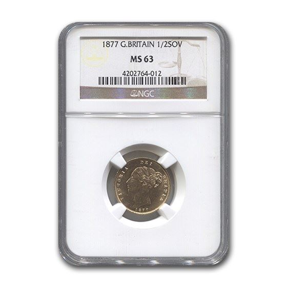 One piece 1877 Great Britain Gold Half Sovereign MS-63 NGC