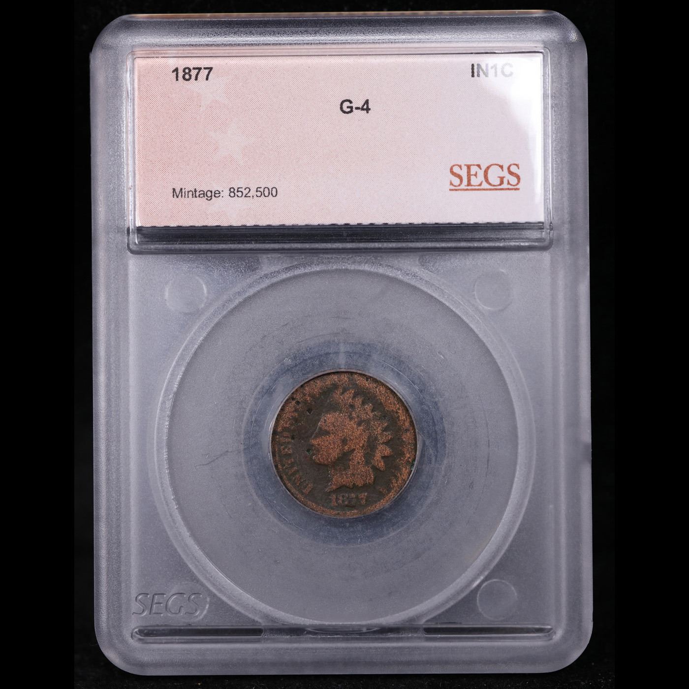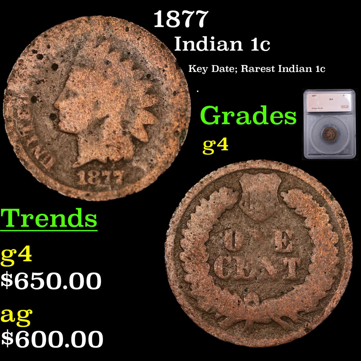 1877 Indian Cent 1c Graded g4 By SEGS. The Key Date to the whole Indian Cent Series. According to Jaime Hernandez from PCGS, ‘The 1877 Indian Cent is unquestionably the most desirable coin in the entire circulation strike Indian Cent series. It is the second lowest mintage coin in the series, and only the 1909-S Indian cent has a lower mintage. Despite the 1877 Indian cent having the second lowest mintage in the series, it also survives in much smaller numbers than the 1909-S Indian cent. This is mainly due to the lack of coins being collected in 1877 compared to 1909. There is only one reverse die confirmed as striking all existing 1877 Indian cents. However, if there was only one reverse die employed to strike all (877,000)1877 Indian cents, then this lone die should have sustained major planchet flaws when striking such a large mintage. Surprisingly, this is not the case since 1877 cents show no traces of a damaged die. Therefore, it is strongly believed that the mintage of 877,000 coins struck, is actually a highly inflated figure.