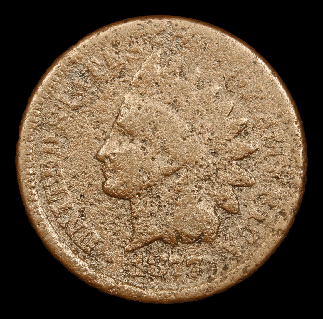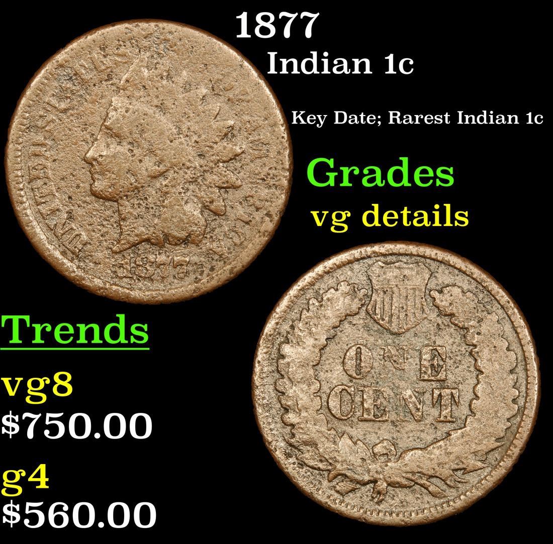 1877 Key Date; Rarest Indian 1c . Indian Cent 1c Grades vg details. The Key Date to the whole Indian Cent Series. According to Jaime Hernandez from PCGS, ‘The 1877 Indian Cent is unquestionably the most desirable coin in the entire circulation strike Indian Cent series. It is the second lowest mintage coin in the series, and only the 1909-S Indian cent has a lower mintage. Despite the 1877 Indian cent having the second lowest mintage in the series, it also survives in much smaller numbers than the 1909-S Indian cent. This is mainly due to the lack of coins being collected in 1877 compared to 1909. There is only one reverse die confirmed as striking all existing 1877 Indian cents. However, if there was only one reverse die employed to strike all (877,000)1877 Indian cents, then this lone die should have sustained major planchet flaws when striking such a large mintage. Surprisingly, this is not the case since 1877 cents show no traces of a damaged die. Therefore, it is strongly believed that the mintage of 877,000 coins struck, is actually a highly inflated figure.