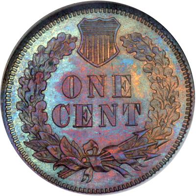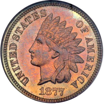 1877 Indian Head Cent. NGC graded Proof 65 Red & Brown. Nice colors on both sides. Only 900+ Proofs minted. While no clear-cut mintage figure exists for this key date, it is thought that some 900 Proofs were struck, as part of both complete Proof sets and "minor" Proof sets containing the cent, three-cent, and nickel coinage -- as well as some that must have been sold as singles over the counter at the Philadelphia Mint. This is very well preserved Gem sporting deeply reflective Proof mirrors in the fields. Both original mint red and mellow golden iridescence, deepening to vibrant blue on the reverse, compete for color dominance on this extremely praiseworthy coin. Fully struck throughout. Pop 11; 1 finer in 66RB.