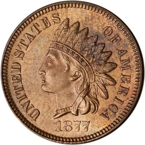 <b>1877 Indian Head Cent. PF63 RB.</b> This is a very choice example with vibrant luster, some original mint red still adhering, and fresh sharp strike. The mintage of this and other Proofs prior to 1878 is not known, and guesses have been made. The Guide Good suggests "900." Bowers estimates 1,250 to 1,500 in his recent study on Indian cents. Most probably the 1877 Proof Indian cents, three-cent pieces and shield nickels were sold in minor sets, and the Proof mintage of all three are the same. However, fewer of the Proof 1877 cents seem to have survived <b>(PCGS # 2319)</b> <i>