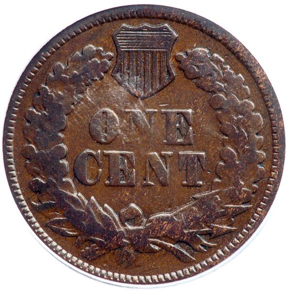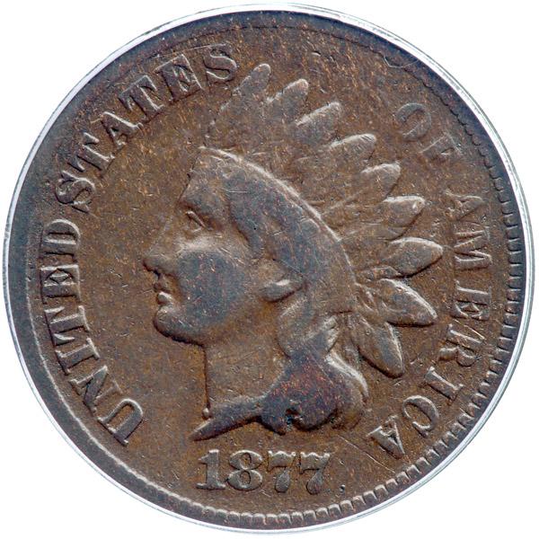 1877 Indian Head Cent. PCGS graded VG-10 Brown. Even wear and balanced chocolate brown to steel-gram color. Scarce year (PCGS # 2127) .