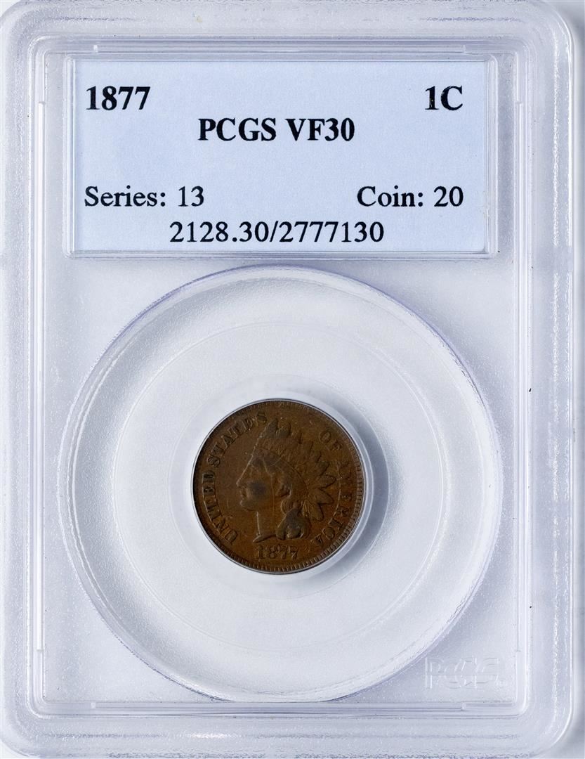 One 1877 Indian Head Cent Coin PCGS VF30. PCGS Graded.