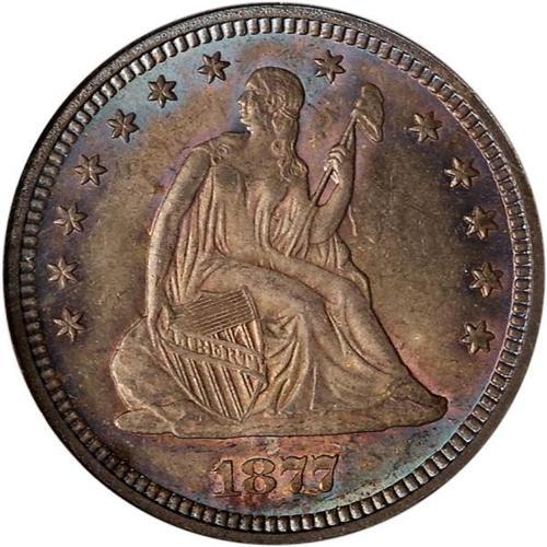 <b>1877 Liberty Seated Quarter Dollar. NGC graded MS66.</b> The limited number of Gem survivors of the 1877 issue never fail to excite bidders when one appears at auction. In addition to unqualified technical superiority, this coin's desirability is enhanced by beautiful steel with blue iridescence, medium gray, and russet toning that spreads evenly over both sides. One would be hard put to find a more truly beautiful gem specimen of a popular With Motto issue with not even a smidgen of softness on the stars, shields, or eagle <b>(PCGS # 5504)</b>