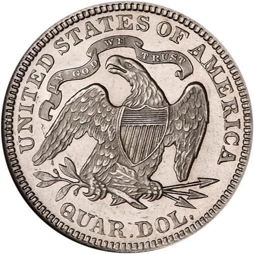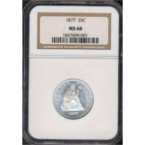 <b>1877 Liberty Seated Quarter Dollar. NGC graded MS68.</b> The output of Seated Liberty Quarters reached its zenith during the years 1876 and 1877, with the supply of Mint State pieces greatly expanded by these six issues, the result of a deliberate program by the government to speed the way to Resumption of a circulating silver coinage. The 1877, in particular, is known for its exceptional luster and high quality. This fully brilliant example full frosty displays satiny luster equally placed over each side in the deeper devices with the portrait, reverse eagle and all of the high points being heavily frosted giving this coin a semi PL look. Sharply defined overall with complete definition even on the right obverse stars. Definitely a premium example. Population: 6 in 68 and none finer. Encased in NGC holder #1827899-001.