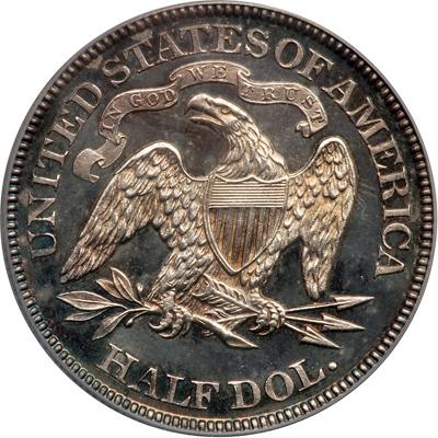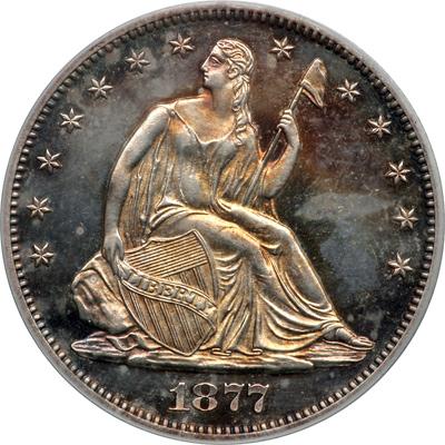 1877 Liberty Seated Half Dollar. PCGS graded Proof 63. This is a splendid toned Proof specimen with a warm golden zephyr-like veil of iridescence on across Liberty's frosted body. Razor-sharp strike for the date, certainly much better quality than some Proof dates in the 1880s when quality tended to slack off at the Philadelphia Mint. Few 1877s offered in recent years; we find it worthy of strong bidder attention. Only 510 minted. Pop 43; 33 finer, 24 in 64, 6 in 65, 3 in 66 (PCGS # 6438) .