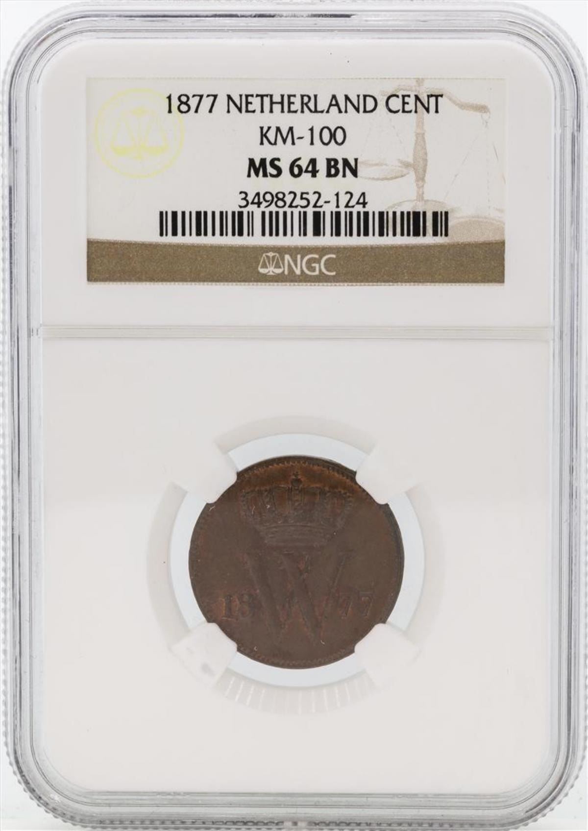 One 1877 Netherland Cent KM-100 NGC MS64 BN. NGC Certified.
