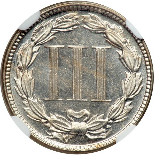 1877 Nickel Three Cents. NGC graded Proof 64 Cameo. Rare Proof-only date with approximately 510 coins struck. A high degree of luster spins smoothly on the satin-mirror nickel pure surfaces of this elusive gem. The strike is crisp in all areas, where all detail may be noted at the head and coronet, the wreath and central Roman numeral. Pop 19.