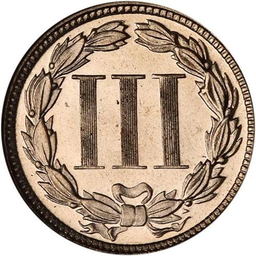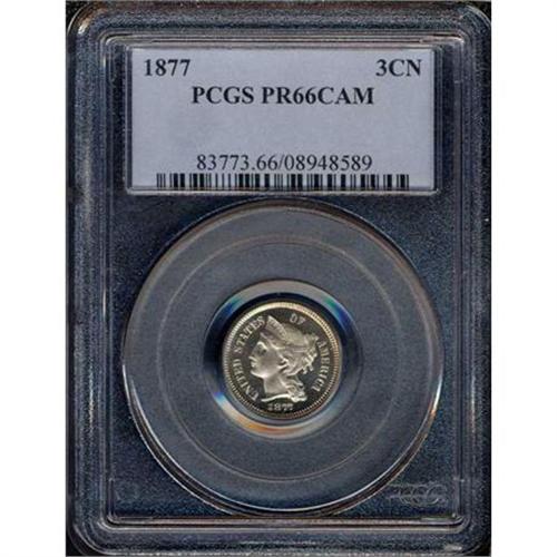 <b>1877 Nickel Three Cents. PCGS graded PF66 CAM.</b> The surfaces are highly lustrous and each side has a light coating of natural nickel-gray patina that swirls and alternates between lighter and darker hues. The fields are mostly reflective, but with the standard mirror-satiny effect seen on many Proofs of the 1870s and 1880s. What gladdens us most is to see a crisp rather than a dullish, smooth impression was left by the pressure of the hardened Proof dies that struck this sharp specimen <b>(PCGS # 3773)</b> <i>
